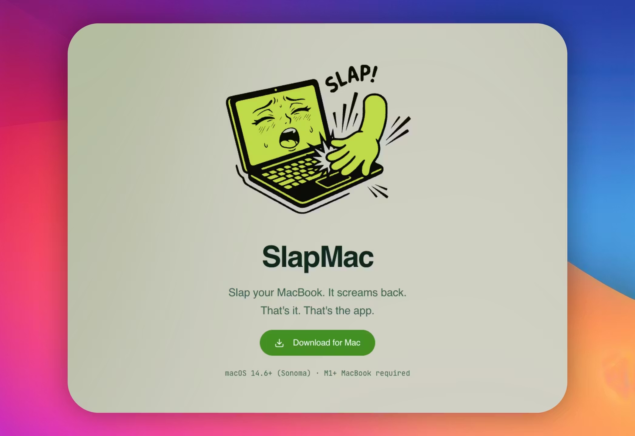 SlapMac is a gloriously unhinged macOS menu bar app that uses your MacBook’s accelerometer to detect physical slaps and screams back with volume proportional to your force. Choose from 9 voice packs with 150+ sound clips, dial in sensitivity and cooldown, and track your lifetime slap count. USB Moaner mode included.